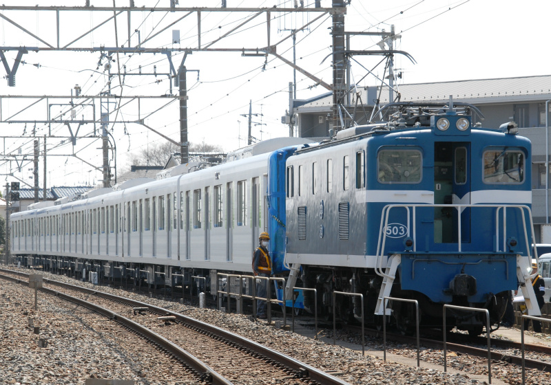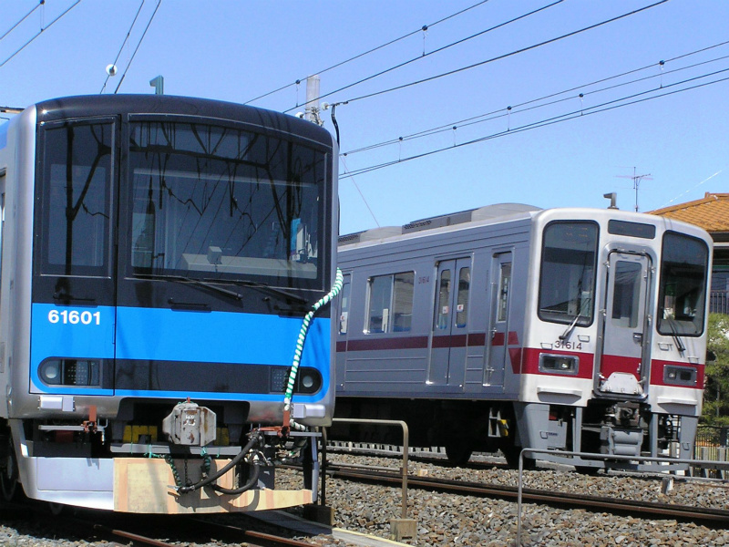 授受線の架線電気を停止して作業を開始。先輩の10030型や30000系と並ぶ。
