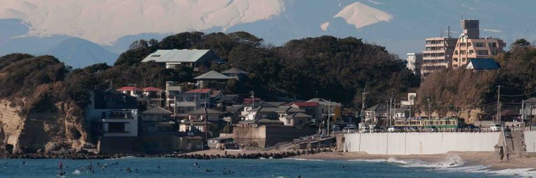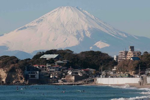 写真は江ノ島電鉄の七里ヶ浜-鎌倉高校前駅間のものになります。決して小さくはない江ノ電の車両も、雄大な富士を背景にすると、そのスケールの大きさを改めて感じます。