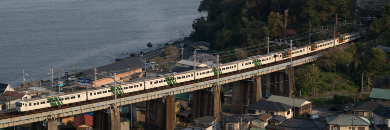 写真の「踊り子」号は国鉄時代に造られた185系電車が使われており、様々な塗装の車両があることが特徴となっています。