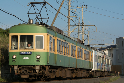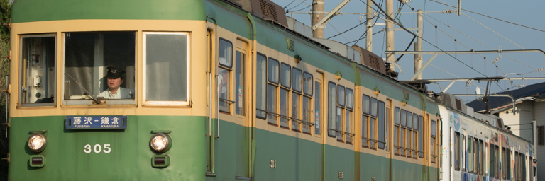 10月のトップ画像は、夕陽を浴びて走る江ノ電です。 江ノ電は神奈川県の鎌倉から藤沢までを結ぶ路線です。沿線には鎌倉や江の島といった観光地が多くあることや、海沿いを走るというロケーションも相まって、 休日には乗車待ちの行列ができてしまうこともある人気の路線です。 写真の300形は現在1編成を残すのみとなってしまいましたが、江ノ電のマスコット的車両として今でも人気のある車両です。 |
