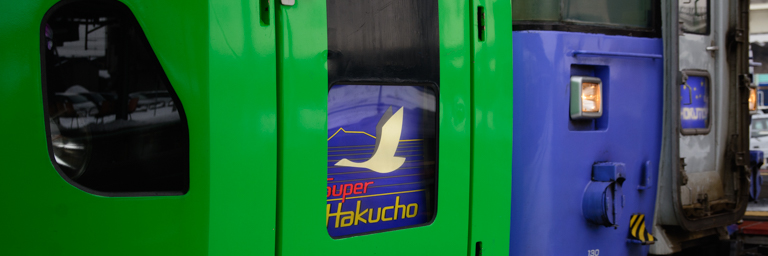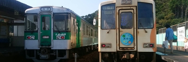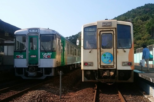 10月のトップ画像は、徳島県での気動車ツーショットです。 JR四国牟岐線と阿佐海岸鉄道の接続駅の海部駅で撮影し、左側がJR四国1200形、右が阿佐海岸鉄道ASA-300形です。 写真のASA-300形は災害で廃止になった高千穂鉄道から譲り受けたもので、側面には「みなでのらんけ」とラッピングされ、存続への願いが込められています。 |